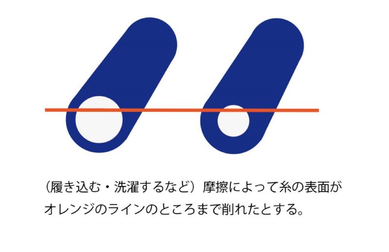 生活の中で生じる衣類への摩擦によって、それぞれ同じだけ糸の表面が削られたとしましょう。